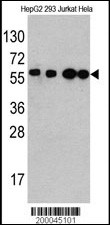 Western blot analysis of anti-BECN1 Mab (Cat. APR06985G) in HepG2, 293, Jurkat and Hela cell line lysates (35μg/lane). BECN1 (arrow) was detected using the Mab ascites (1:2000 dilution).
