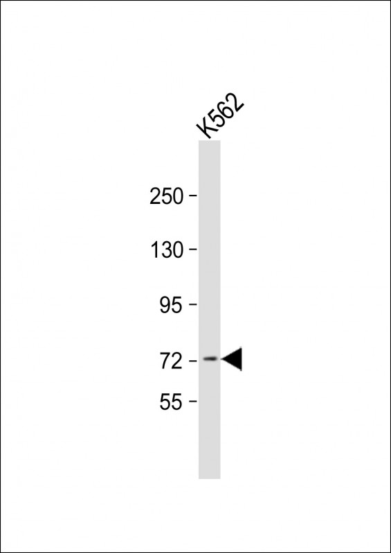 Anti- at 1:1000 dilution + K562 whole cell lysate Lysates/proteins at 20 μg per lane. Secondary Goat Anti-mouse IgG, (H+L), Peroxidase conjugated at 1/10000 dilution. Predicted band size : 74 kDa Blocking/Dilution buffer: 5% NFDM/TBST.