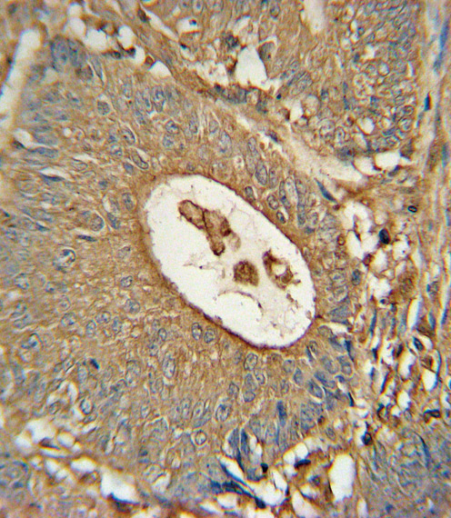 ACOX1 Monoclonal Antibody (Cat. APG01506G) immunohistochemistry analysis in formalin fixed and paraffin embedded human colon carcinoma followed by peroxidase conjμgation of the secondary antibody and DAB staining. This data demonstrates the use of the ACOX1 Monoclonal Antibody for immunohistochemistry. Clinical relevance has not been evaluated.