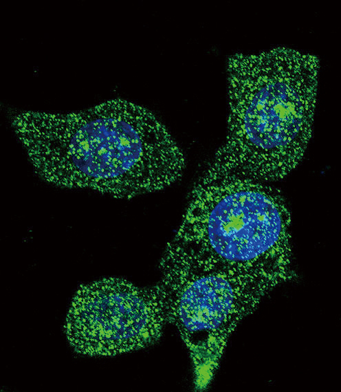Confocal immunofluorescent analysis of ACOX1 Antibody ( APG01506G) with Hela cell followed by Alexa Fluor? 488-conjugated goat anti-mouse lgG (green). DAPI was used to stain the cell nuclear (blue). |