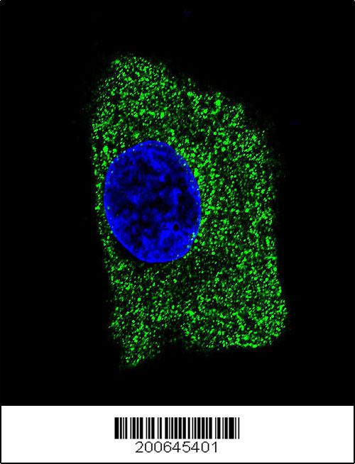Confocal immunofluorescent analysis of LAMP2 Antibody ( APR08129G) with HepG2 cell followed by Alexa Fluor? 488-conjugated goat anti-mouse lgG (green). DAPI was used to stain the cell nuclear (blue). |