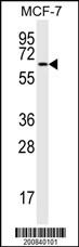 MAP2 Antibody (Cat. APR11275G) western blot analysis in MCF-7 cell line lysates (15μg/lane).This demonstrates the MAP2 antibody detected the MAP2 protein (arrow).(1:1000)