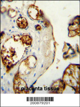 TNK1 Monoclonal( Ascites) (Cat. AMM08261G) immunohistochemistry analysis in formalin fixed and paraffin embedded human placenta tissue followed by peroxidase conjμgation of the secondary antibody and DAB staining. This data demonstrates the use of the TNK1 Monoclonal( Ascites) for immunohistochemistry. Clinical relevance has not been evaluated. |