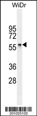 CABC1 antibody (Cat. APG02322G) western blot analysis in Widr cell line lysates (35μg/lane).This demonstrates the CABC1 antibody detected the CABC1 protein (arrow). |