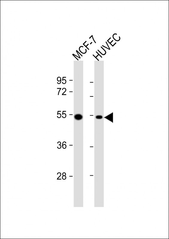 All lanes : Anti-TGFB2 antibody at 1:1000 dilution Lane 1: MCF-7 whole cell lysate Lane 2: HUVEC whole cell lysate Lysates/proteins at 20 μg per lane. Secondary Goat Anti-mouse IgG, (H+L), Peroxidase conjugated at 1/10000 dilution. Predicted band size : 48 kDa Blocking/Dilution buffer: 5% NFDM/TBST.