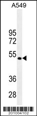 TGFB2 antibody (Cat. APR10418G) western blot analysis in A549 cell line lysates (35μg/lane).This demonstrates the TGFB2 antibody detected the TGFB2 protein (arrow). |