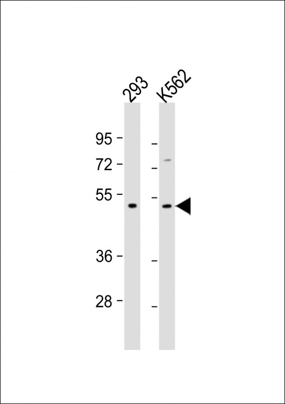All lanes : Anti- at 1:500-1:1000 dilution Lane 1: 293 whole cell lysate Lane 2: K562 whole cell lysate Lysates/proteins at 20 μg per lane. Secondary Goat Anti-mouse IgG, (H+L), Peroxidase conjugated at 1/10000 dilution. Predicted band size : 48 kDa Blocking/Dilution buffer: 5% NFDM/TBST.