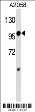 MAP4K3 (Cat. APR08342G) western blot analysis in A2058 cell line lysates (35μg/lane).This demonstrates the MAP4K3 antibody detected the MAP4K3 protein (arrow). |