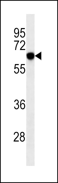 RYK (Cat. AMM07705G) western blot analysis in U251 cell line lysates (35μg/lane).This demonstrates the RYK antibody detected the RYK protein (arrow). |