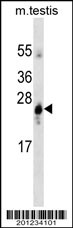GSTA1 (Cat. AMM05230G) western blot analysis in mouse testis tissue lysates (35μg/lane).This demonstrates the GSTA1 antibody detected the GSTA1 protein (arrow). |