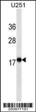 EIF4EBP1 Antibody (Cat. APR07668G) western blot analysis in U251 cell line lysates (35μg/lane).This demonstrates the EIF4EBP1 antibody detected the EIF4EBP1 protein (arrow). |