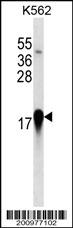 EIF4EBP1 Antibody (Cat. APR07667G) western blot analysis in K562 cell line lysates (35μg/lane).This demonstrates the EIF4EBP1 antibody detected the EIF4EBP1 protein (arrow). |
