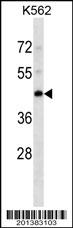 PDK4 Antibody (Cat. APR09014G) western blot analysis in K562 cell line lysates (35μg/lane).This demonstrates the PDK4 antibody detected the PDK4 protein (arrow). |