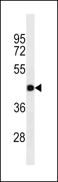 GJC2 Antibody (N-term) (Cat. AMM05918G) western blot analysis in A549 cell line lysates (35μg/lane).This demonstrates the GJC2 antibody detected the GJC2 protein (arrow). |