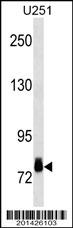 RPS6KA3 Antibody (Cat. AMM07660G) western blot analysis in U251 cell line lysates (35μg/lane).This demonstrates the RPS6KA3 antibody detected the RPS6KA3 protein (arrow). |