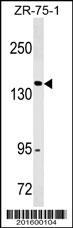 ITGAX/CD11c Antibody (N-term) (Cat. APR16921G) western blot analysis in ZR-75-1 cell line lysates (35μg/lane).This demonstrates the ITGAX/CD11c antibody detected the ITGAX/CD11c protein (arrow). |