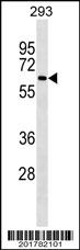 NCOA4 Antibody (Cat. APR17540G) western blot analysis in 293 cell line lysates (35μg/lane).This demonstrates the NCOA4 antibody detected the NCOA4 protein (arrow). |