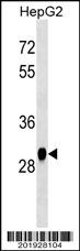 HNMT Antibody (Cat. APR12378G) western blot analysis in HepG2 cell line lysates (35μg/lane).This demonstrates the HNMT antibody detected the HNMT protein (arrow). |