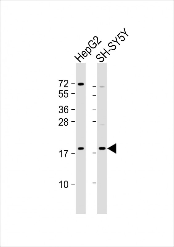 All lanes : Anti- at 1:1000 dilution Lane 1: HepG2 whole cell lysate Lane 2: SH-SY5Y whole cell lysate Lysates/proteins at 20 μg per lane. Secondary Goat Anti-mouse IgG, (H+L), Peroxidase conjugated at 1/10000 dilution. Predicted band size : 14 kDa Blocking/Dilution buffer: 5% NFDM/TBST.