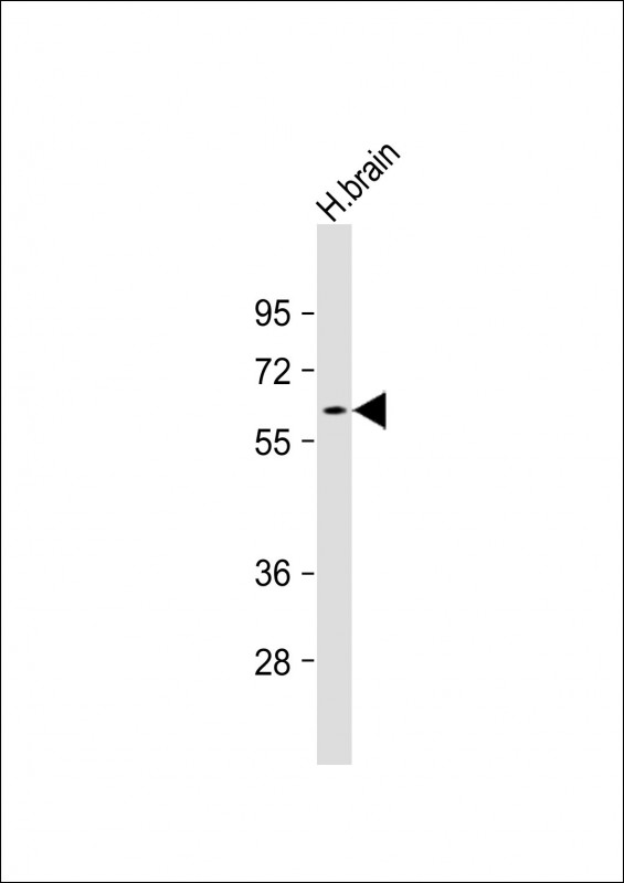 Anti- at 1:500 dilution + human brain lysate Lysates/proteins at 20 μg per lane. Secondary Goat Anti-mouse IgG, (H+L), Peroxidase conjugated at 1/10000 dilution. Predicted band size : 65 kDa Blocking/Dilution buffer: 5% NFDM/TBST.