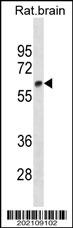 GAD2 Antibody (Cat. AMM04665G) western blot analysis in rat brain tissue lysates (35μg/lane).This demonstrates the GAD2 antibody detected the GAD2 protein (arrow). |