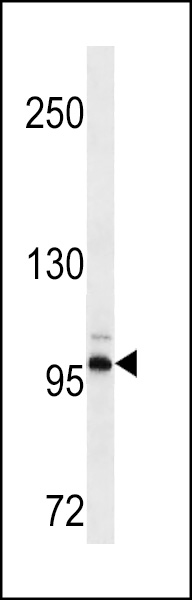 DDR2 Antibody (Cat. APR11715G) western blot analysis in HepG2 cell line lysates (35μg/lane).This demonstrates the DDR2 antibody detected the DDR2 protein (arrow). |