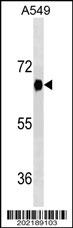 DYRK2 Antibody (Cat. AMM06985G) western blot analysis in A549 cell line lysates (35μg/lane).This demonstrates the DYRK2 antibody detected the DYRK2 protein (arrow). |