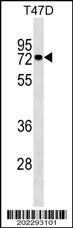 MX1 Antibody (Cat. APR11143G) western blot analysis in T47D cell line lysates (35μg/lane).This demonstrates the MX1 antibody detected the MX1 protein (arrow). |