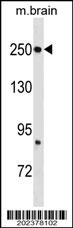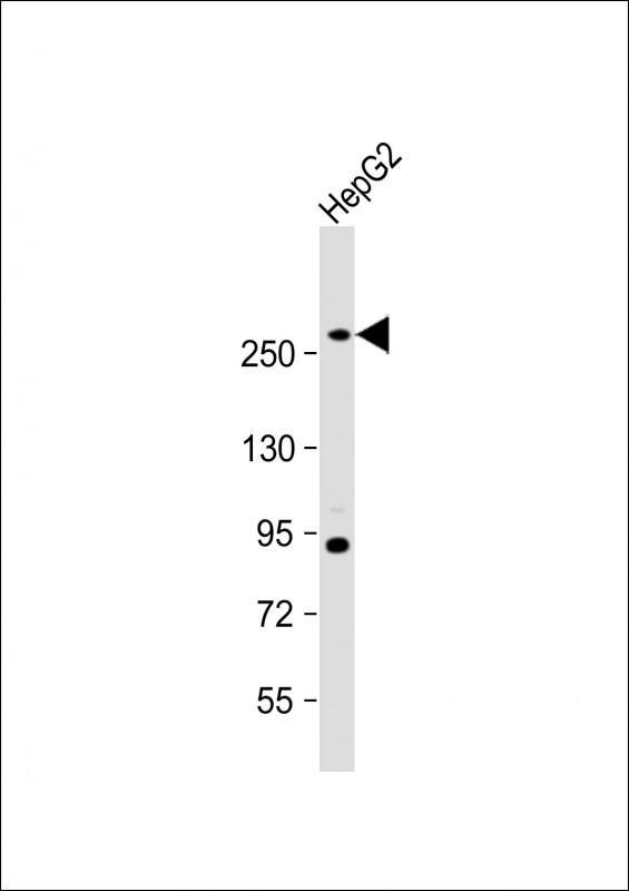 Anti- at 1:1000 dilution + HepG2 whole cell lysate Lysates/proteins at 20 μg per lane. Secondary Goat Anti-mouse IgG, (H+L), Peroxidase conjugated at 1/10000 dilution. Predicted band size : 273 kDa Blocking/Dilution buffer: 5% NFDM/TBST.