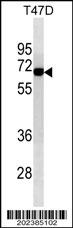 ALB Antibody (Cat. APG01721G) western blot analysis in T47D cell line lysates (35μg/lane).This demonstrates the ALB antibody detected the ALB protein (arrow). |