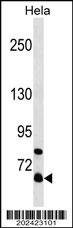 FMR1 Antibody (Cat. AMM05882G) western blot analysis in Hela cell line lysates (35μg/lane).This demonstrates the FMR1 antibody detected the FMR1 protein (arrow). |
