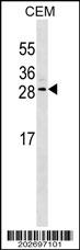 EPO Antibody (Cat. AMM04426G) western blot analysis in CEM cell line lysates (35μg/lane).This demonstrates the EPO antibody detected the EPO protein (arrow). |