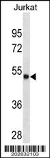 ARSA Antibody (C-term) (Cat. APG01997G) western blot analysis in Jurkat cell line lysates (35μg/lane).This demonstrates the ARSA antibody detected the ARSA protein (arrow). |