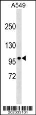 DISC1 Antibody (C-term)(Ascites)(Cat. APR11723G) western blot analysis in A549 cell line lysates (35μg/lane).This demonstrates the DISC1 antibody detected the DISC1 protein (arrow). |