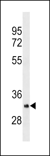 OR5B12 Antibody (C-term)(Ascites)(Cat. APR12598G) western blot analysis in human placenta tissue lysates (35μg/lane).This demonstrates the OR5B12 antibody detected the OR5B12 protein (arrow). |