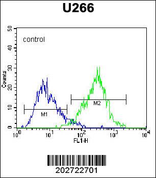 CD138 Antibody (C-term) (Ascites) (Cat. APG02479G) flow cytometric analysis of U266 cells (right histogram) compared to a negative control cell (left histogram).Alexa Fluor? 488-conjugated donkey anti-mouse lgG secondary antibodies were used for the analysis