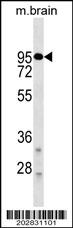 DRD2 Antibody (C-term)(Ascites)(Cat. APR11788G) western blot analysis in mouse brain tissue lysates (35μg/lane).This demonstrates the DRD2 antibody detected the DRD2 protein (arrow).
