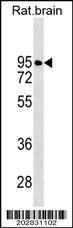 DRD2 Antibody (C-term)(Ascites) (Cat. APR11788G) western blot analysis in rat brain tissue lysates (35μg/lane).This demonstrates the DRD2 antibody detected the DRD2 protein (arrow). |