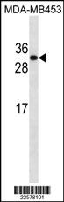 DDIT3 Antibody (Cat. APR07532G) western blot analysis in MDA-MB435 cell line lysates (35μg/lane).This demonstrates the DDIT3 antibody detected the DDIT3 protein (arrow). |
