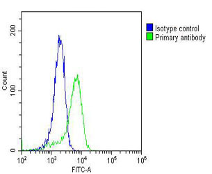 Overlay histogram showing PC-3 cells stained with AMM07448G(green line). The cells were fixed with 2% paraformaldehyde (10 min). The cells were then icubated in 2% bovine serum albumin to block non-specific protein-protein interactions followed by the antibody (AMM07448G, 1:25 dilution) for 60 min at 37?C. The secondary antibody used was Goat-Anti-Mouse IgG, DyLight? 488 Conjugated Highly Cross-Adsorbed(OJ192088) at 1/200 dilution for 40 min at 37?C. Isotype control antibody (blue line) was mouse IgG1 (1μg/1x10^6 cells) used under the same conditions. Acquisition of >10, 000 events was performed.
