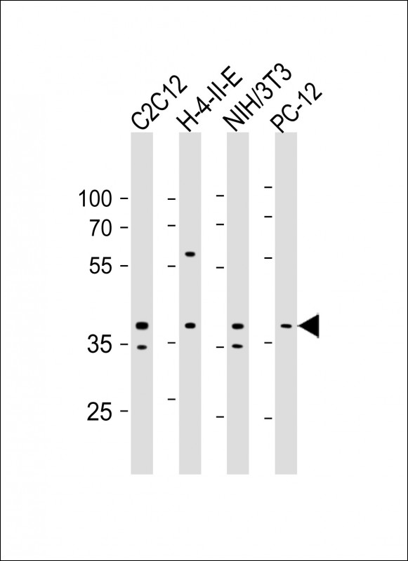 All lanes : Anti-PRKAB1 Antibody at 1:2000 dilution Lane 1: C2C12 whole cell lysate Lane 2: H-4-II-E whole cell lysate Lane 3: NIH/3T3 whole cell lysate Lane 4: PC-12 whole cell lysate Lysates/proteins at 20 μg per lane. Secondary Goat Anti-mouse IgG, (H+L), Peroxidase conjugated at 1/10000 dilution. Predicted band size : 30 kDa Blocking/Dilution buffer: 5% NFDM/TBST. |