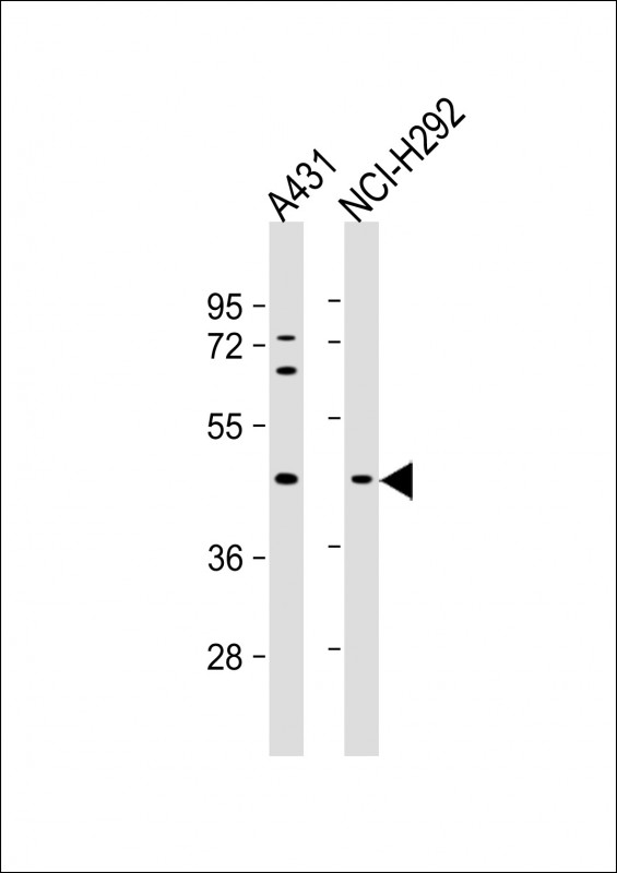 All lanes : Anti-SERPINB3 at 1:4000 dilution Lane 1: A431 whole cell lysate Lane 2: NCI-H292 whole cell lysate Lysates/proteins at 20 μg per lane. Secondary Goat Anti-mouse IgG, (H+L), Peroxidase conjugated at 1/10000 dilution. Predicted band size : 45 kDa Blocking/Dilution buffer: 5% NFDM/TBST. |