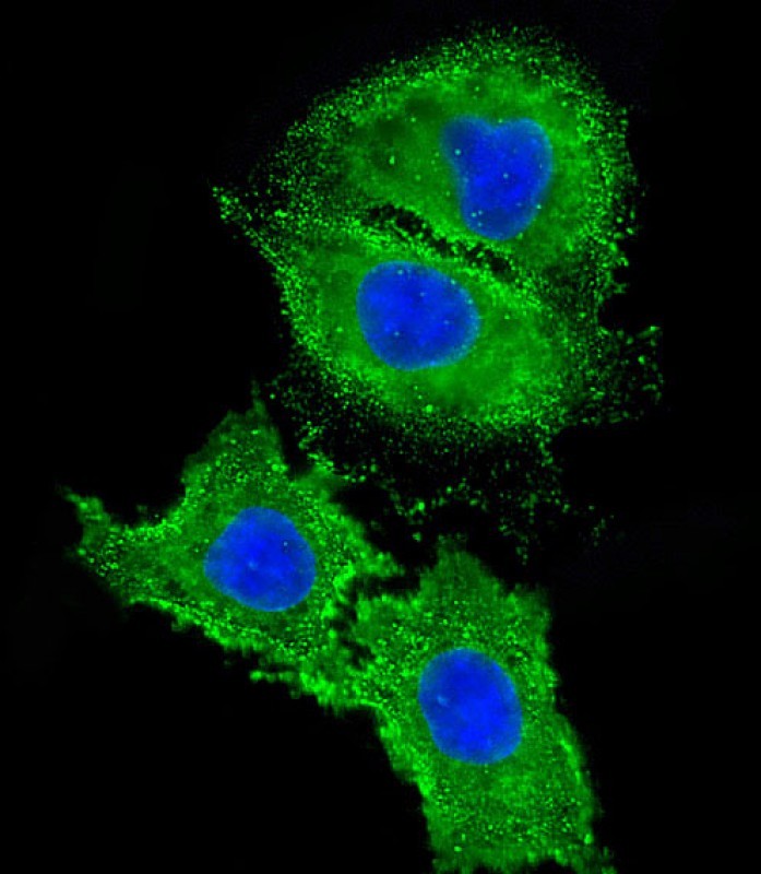 Immunofluorescent analysis of 4% paraformaldehyde-fixed, 0. 1% Triton X-100 permeabilized HepG2 (human liver hepatocellular carcinoma cell line) cells labeling Pdx1 with AP10119B at 1/25 dilution, followed by Dylight? 488-conjugated goat anti-rabbit IgG (NK179883) secondary antibody at 1/200 dilution (green). Immunofluorescence image showing membrane and cytoplasm staining on HepG2 cell line. The nuclear counter stain is DAPI (blue).