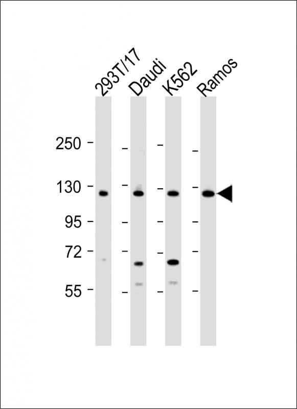 All lanes : Anti-BACH2 Antibody (C-term) at 1:2000 dilution Lane 1: 293T/17 whole cell lysate Lane 2: Daudi whole cell lysate Lane 3: K562 whole cell lysate Lane 4: Ramos whole cell lysate Lysates/proteins at 20 μg per lane. Secondary Goat Anti-Rabbit IgG, (H+L), Peroxidase conjugated at 1/10000 dilution. Predicted band size : 93 kDa Blocking/Dilution buffer: 5% NFDM/TBST.