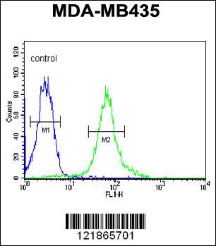 BACH2 Antibody (C-term) (Cat. APR07075G) flow cytometric analysis of MDA-MB435 cells (right histogram) compared to a negative control cell (left histogram).FITC-conjugated goat-anti-rabbit secondary antibodies were used for the analysis. |