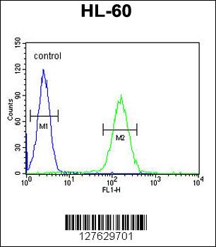 NOS1AP Antibody (Center) (Cat. AMM06751G) flow cytometric analysis of HL-60 cells (right histogram) compared to a negative control cell (left histogram).FITC-conjugated goat-anti-rabbit secondary antibodies were used for the analysis. |
