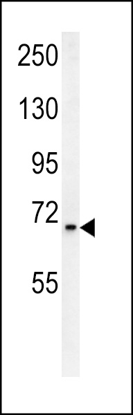 SLC25A12 Antibody (N-Term) (Cat. APR10045G) western blot analysis in mouse bladder tissue lysates (15ug/lane).This demonstrates the SLC25A12 antibody detected SLC25A12 protein (arrow).