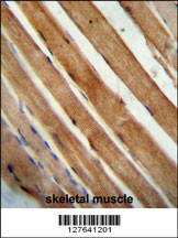 SLC25A12 antibody (N-Term) (Cat. APR10045G) immunohistochemistry analysis in formalin fixed and paraffin embedded human skeletal muscle followed by peroxidase conjugation of the secondary antibody and DAB staining. This data demonstrates the use of the SLC25A12 antibody (N-Term) for immunohistochemistry. Clinical relevance has not been evaluated. |