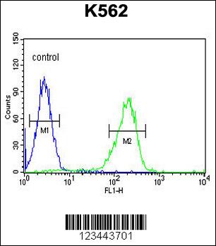 CLIC6 Antibody (Center) (Cat. APG02660G) flow cytometric analysis of K562 cells (right histogram) compared to a negative control cell (left histogram).FITC-conjugated goat-anti-rabbit secondary antibodies were used for the analysis. |