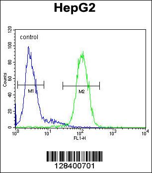 S100Z Antibody (N-term) (Cat. AMM07719G) flow cytometric analysis of HepG2 cells (right histogram) compared to a negative control cell (left histogram).FITC-conjugated goat-anti-rabbit secondary antibodies were used for the analysis.